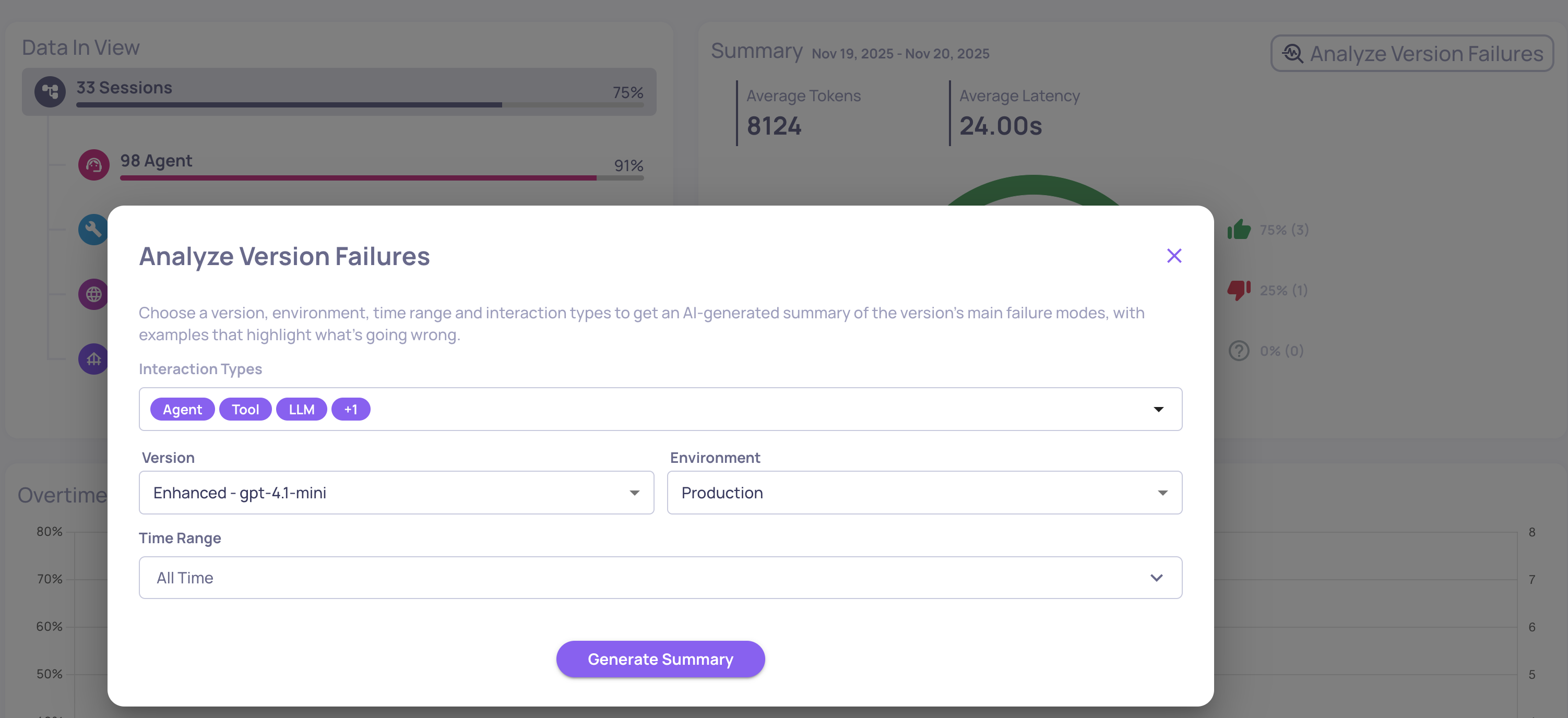 In addition to property-level insights, Deepchecks now generates a **version-level failure mode analysis report. **It aggregates failures across all interaction types and selected properties, providing a consolidated view of dominant issues in the system. Ideal for spotting cross-cutting problems, prioritizing improvements, and detecting regressions. Access this from the Version page via “Analyze version failures.” For more information, click here.