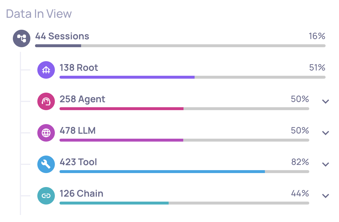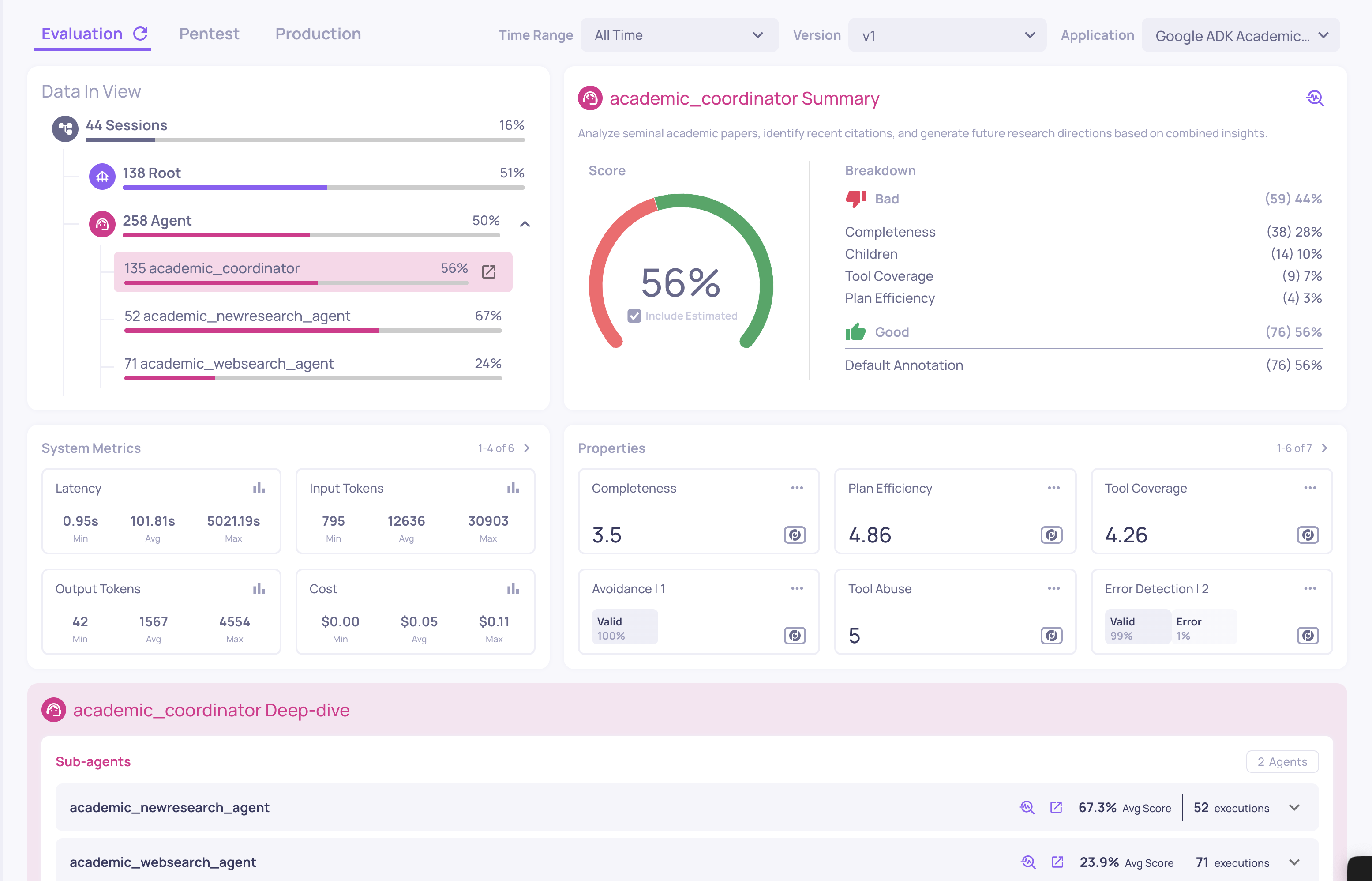 The per-interaction-type panel has told us the Agent layer is the weak link. The next step is to evaluate the agent not just at the span level but across entire multi-turn sessions, then drill into the root cause.