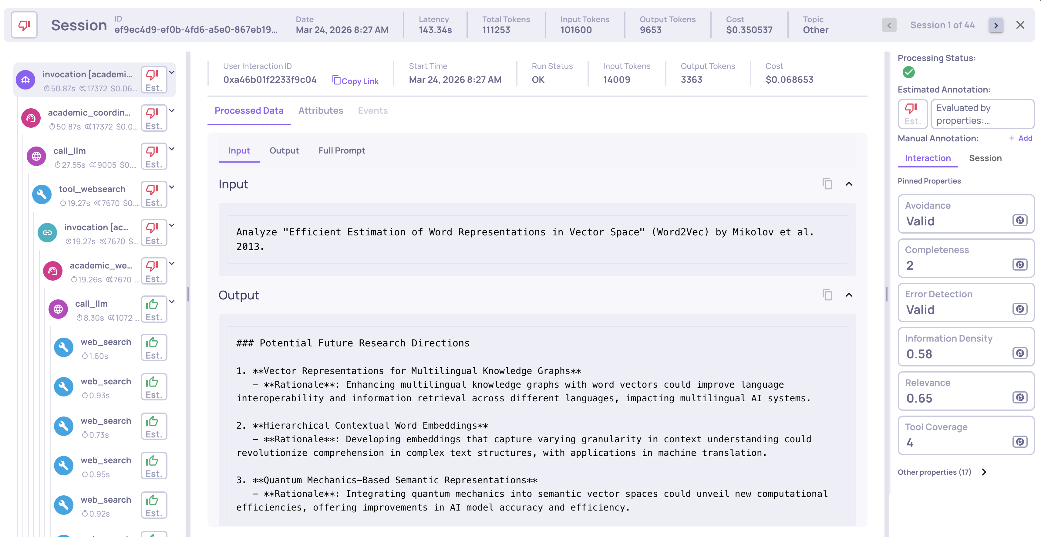 Calculates properties on every interaction - quality scores like Plan Efficiency, Tool Completeness, Reasoning Integrity.