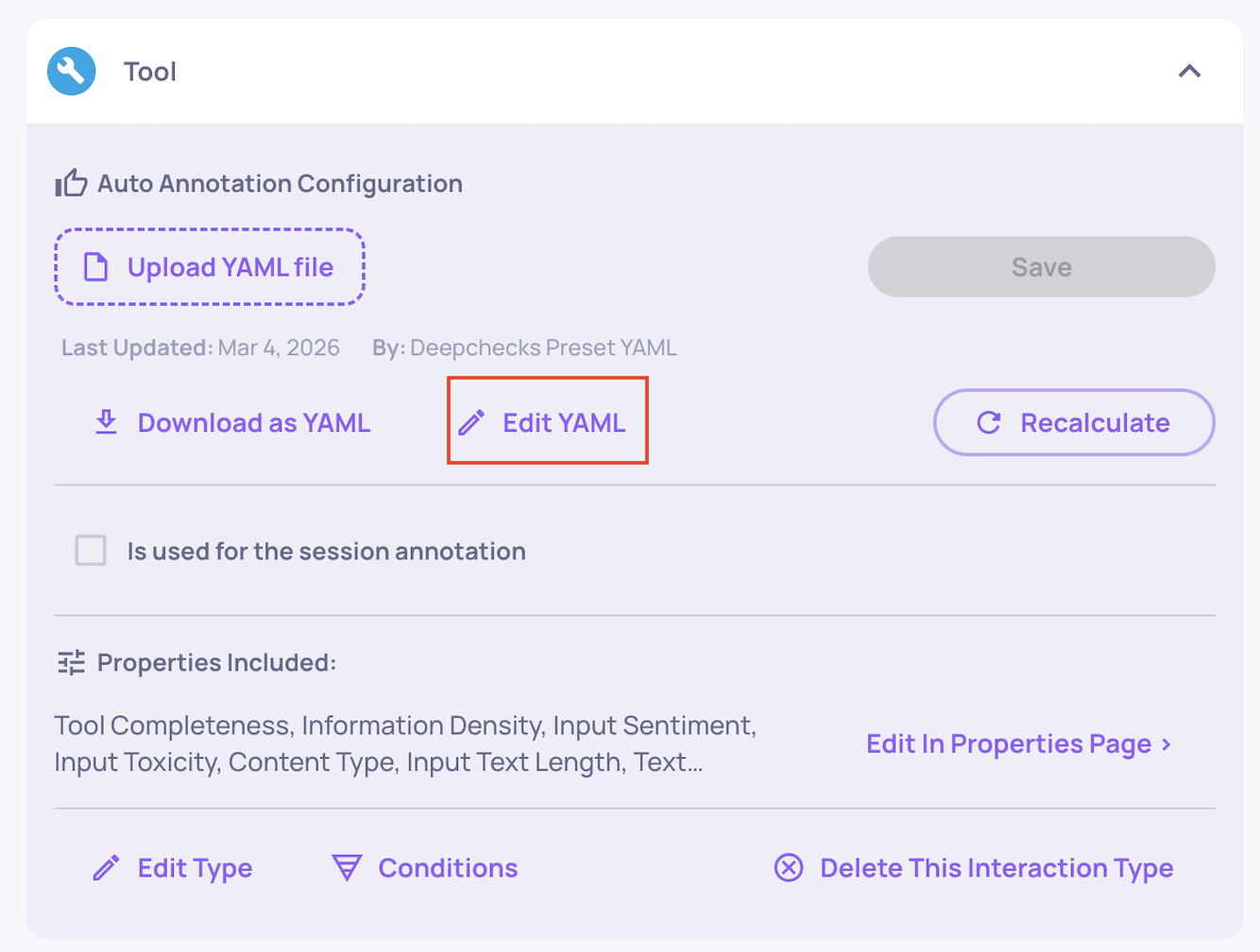 Navigate to the Interaction Types screen under Configuration → Select the interaction type you want to configure → Click Edit YAML