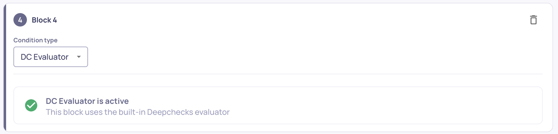 - Change block type - Use the type dropdown in the block header to switch between property, similarity, children, or Deepchecks Evaluator