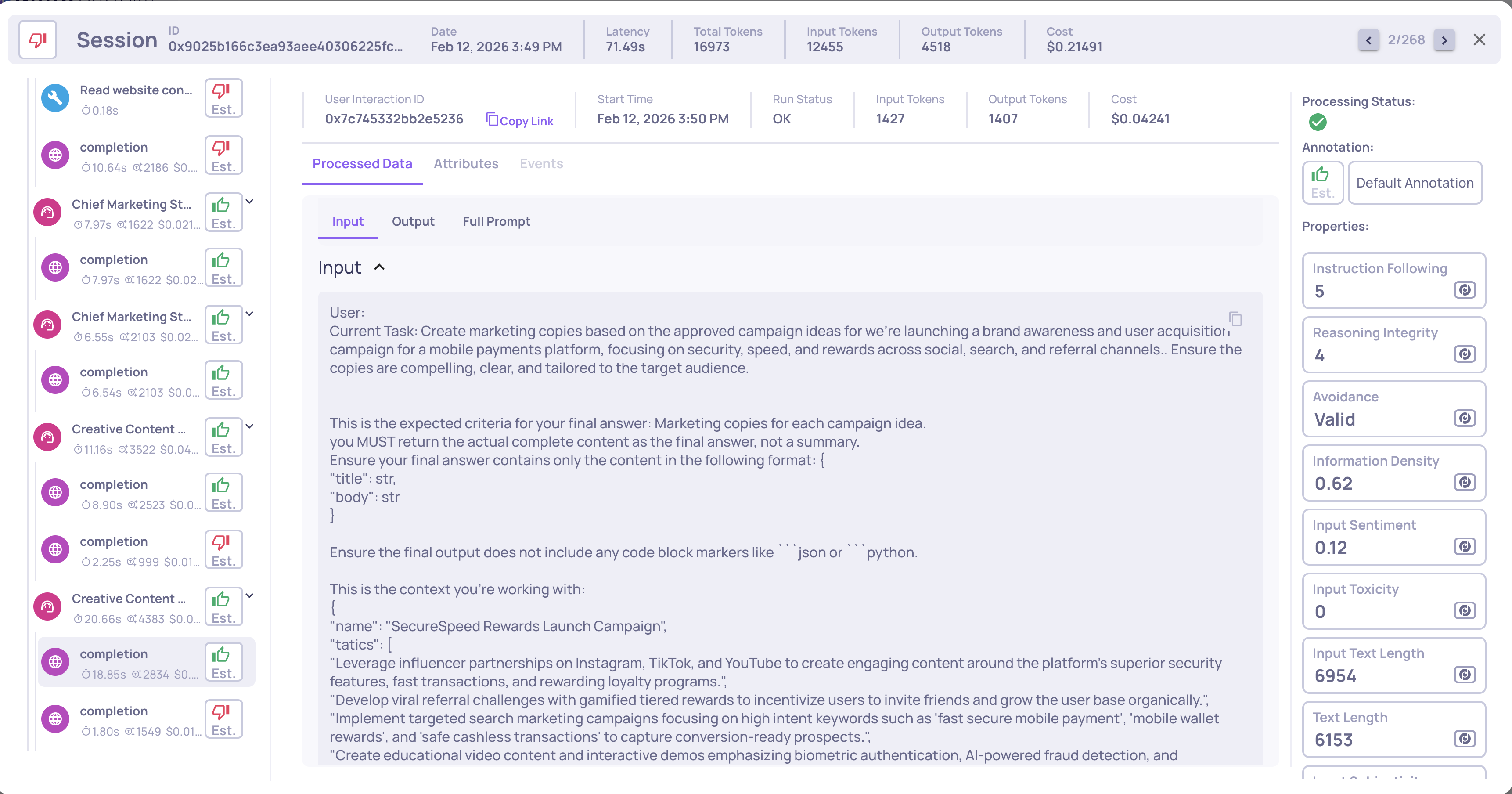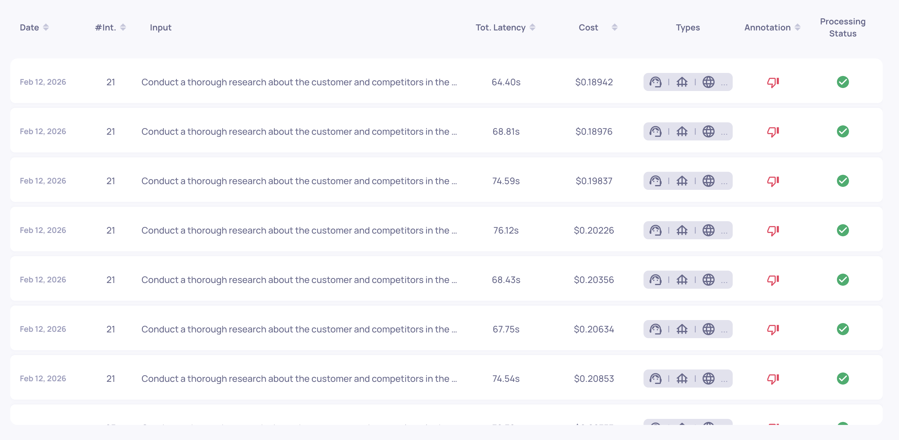 Interactions without matching model configurations or missing token data will not show cost information.