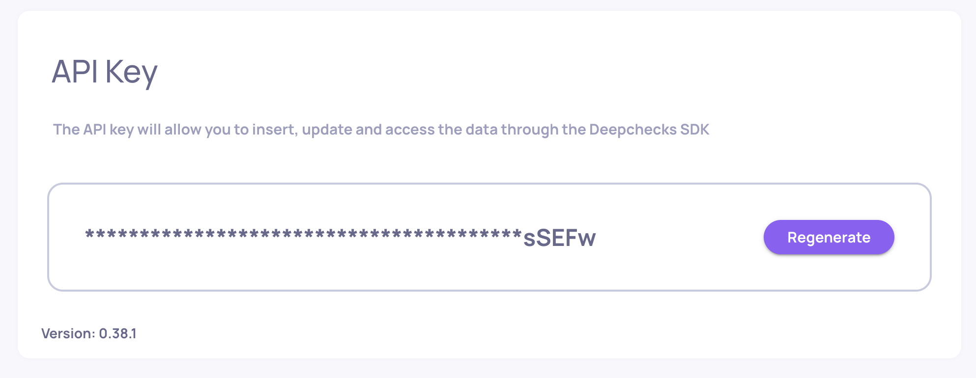 Verify using visible letters: The last characters of the key are visible - use them to confirm that a key in your environment matches your Deepchecks API key.