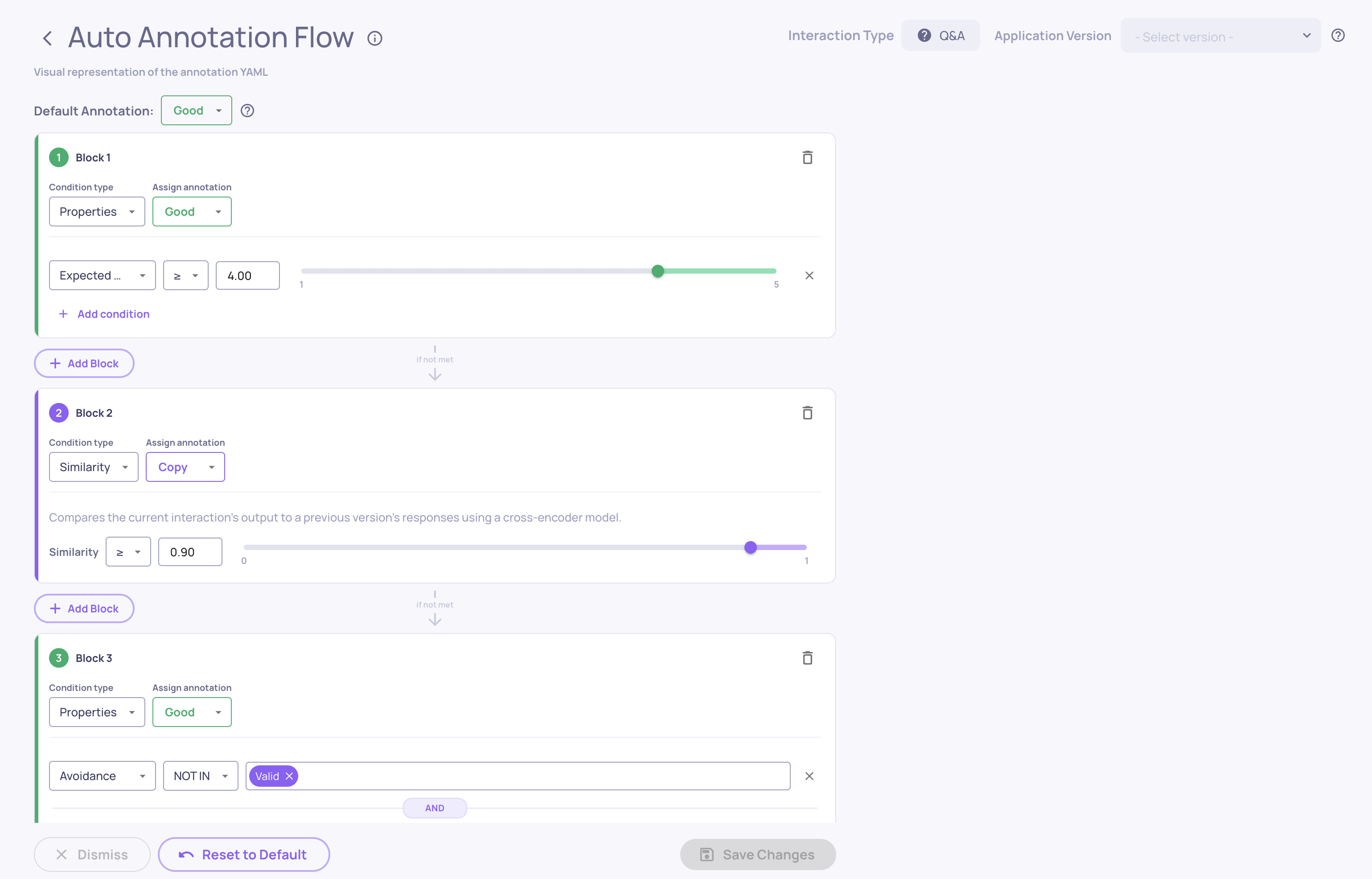 The default annotation pipeline works for RAG, but tune the thresholds based on what you see in Step 4. Go to Configure Auto Annotation in the UI and use the visual threshold editor to set the score cutoff for each property - the histogram view shows you where good and bad interactions separate naturally.