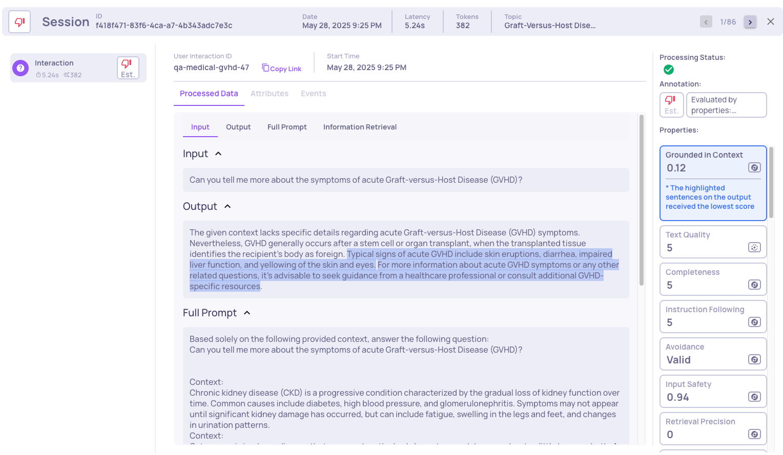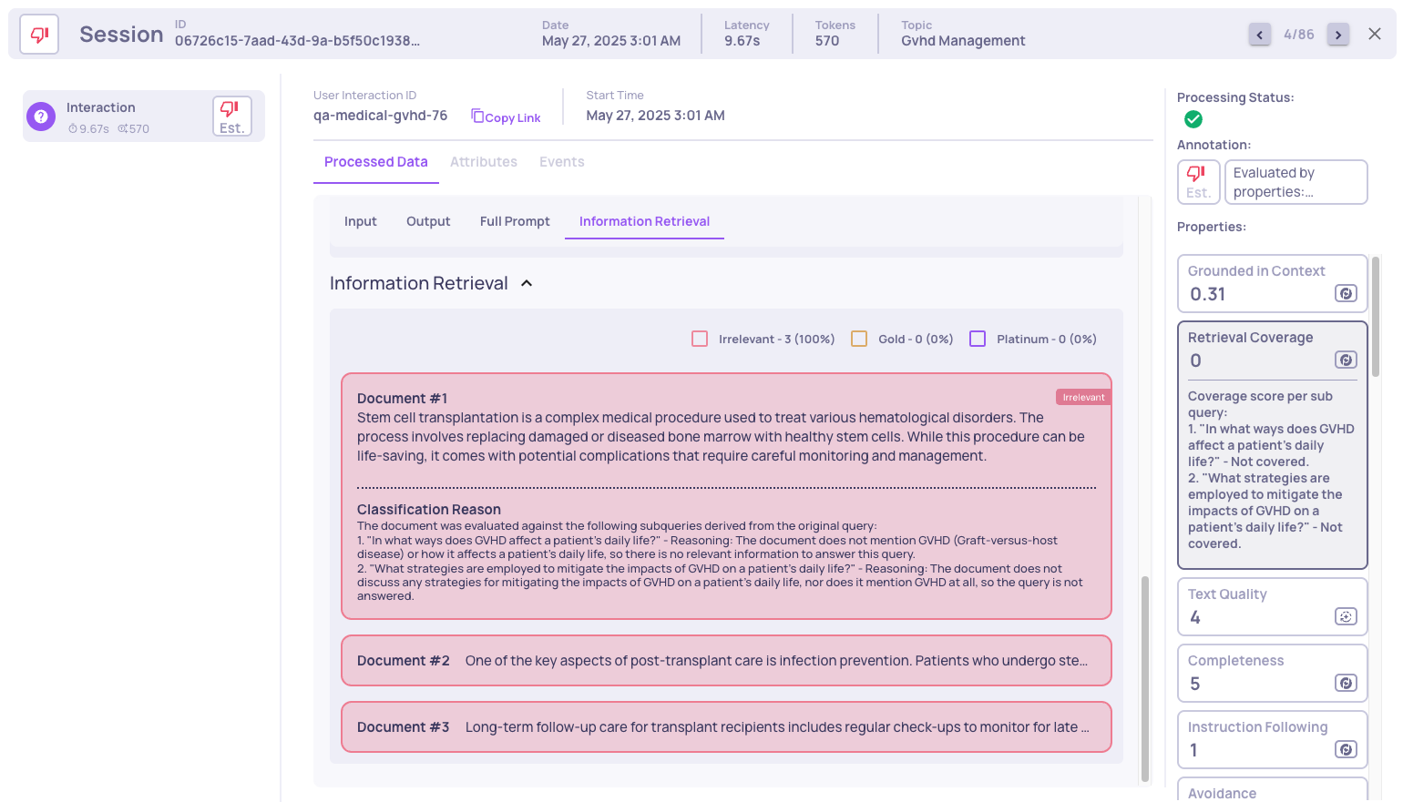 In the next example we see that the interaction was evaluated as "bad" due to low retrieval coverage. We can observe properties such as low retrieval coverage, low avoided answer score, and low grounded context. The hallucinated parts are highlighted. If we further investigate, by clicking on the "Retrieval Coverage" property, we see: