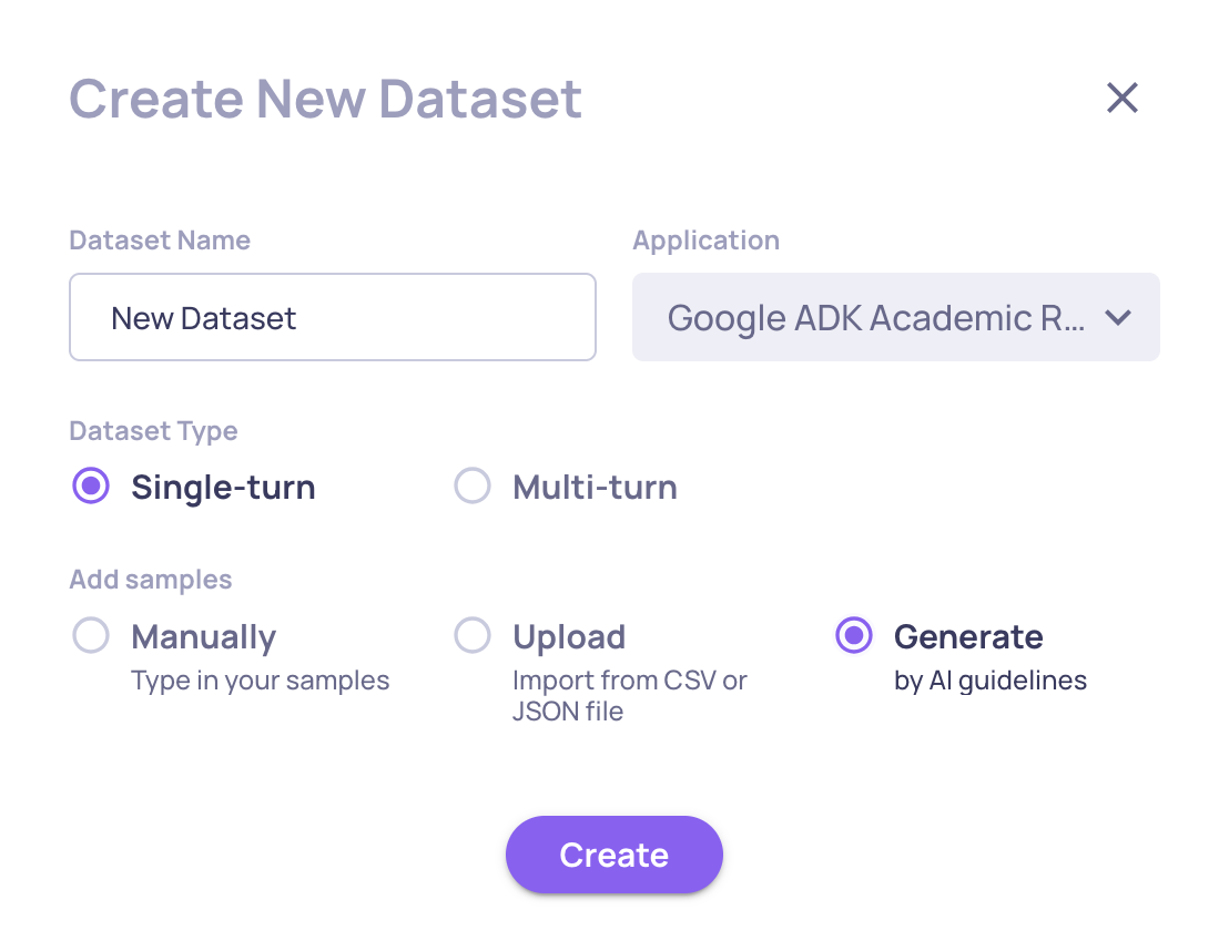 You need a dataset of test inputs to run against your agent. You can create one manually, import an existing one, or use AI to generate it.