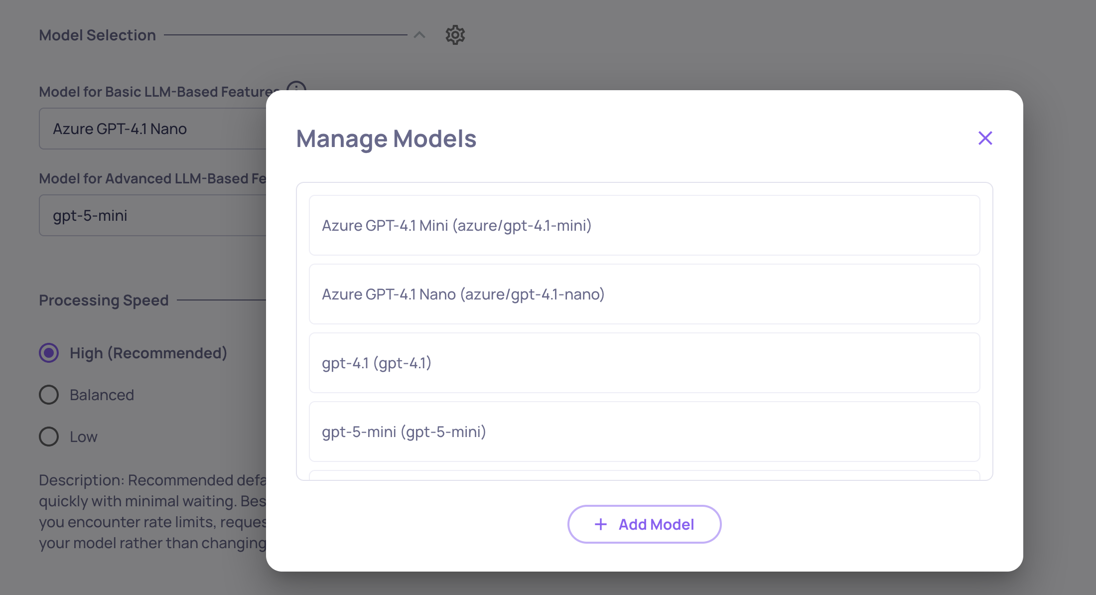 This opens the Manage Models modal where you can view, add, edit, and delete models.