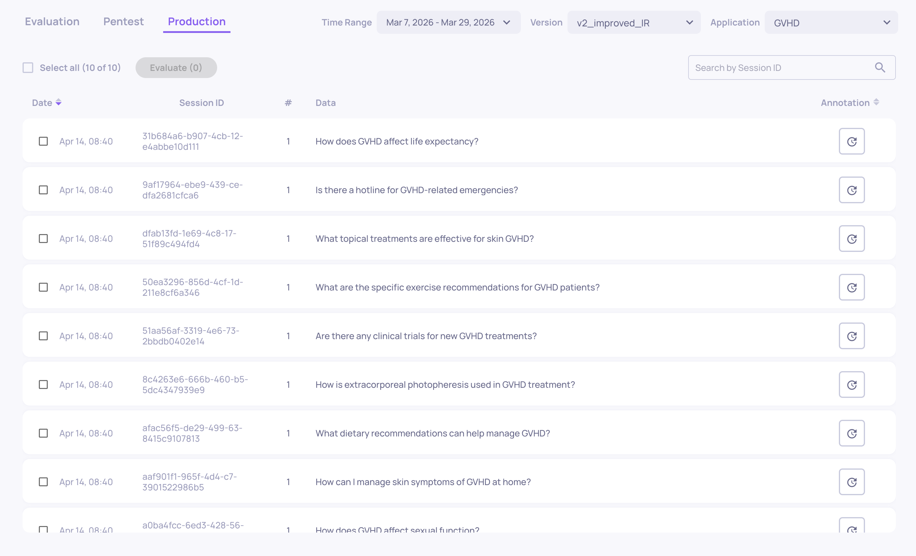 This is the primary screen for finding specific failures, reviewing individual interactions, and adding manual annotations.