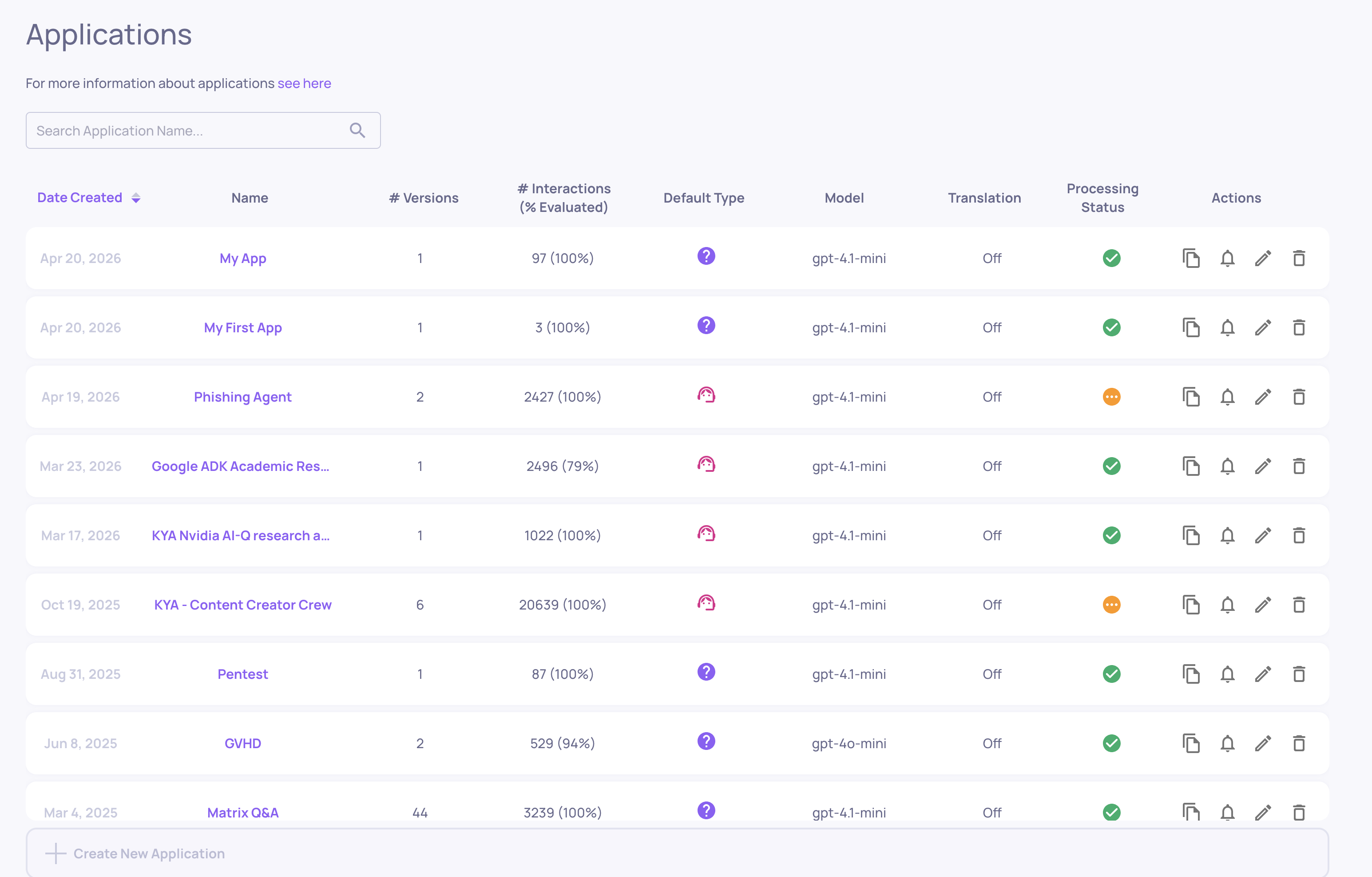 The home screen for your workspace. Shows all your applications - each one represents a distinct LLM task or product. From here you can: