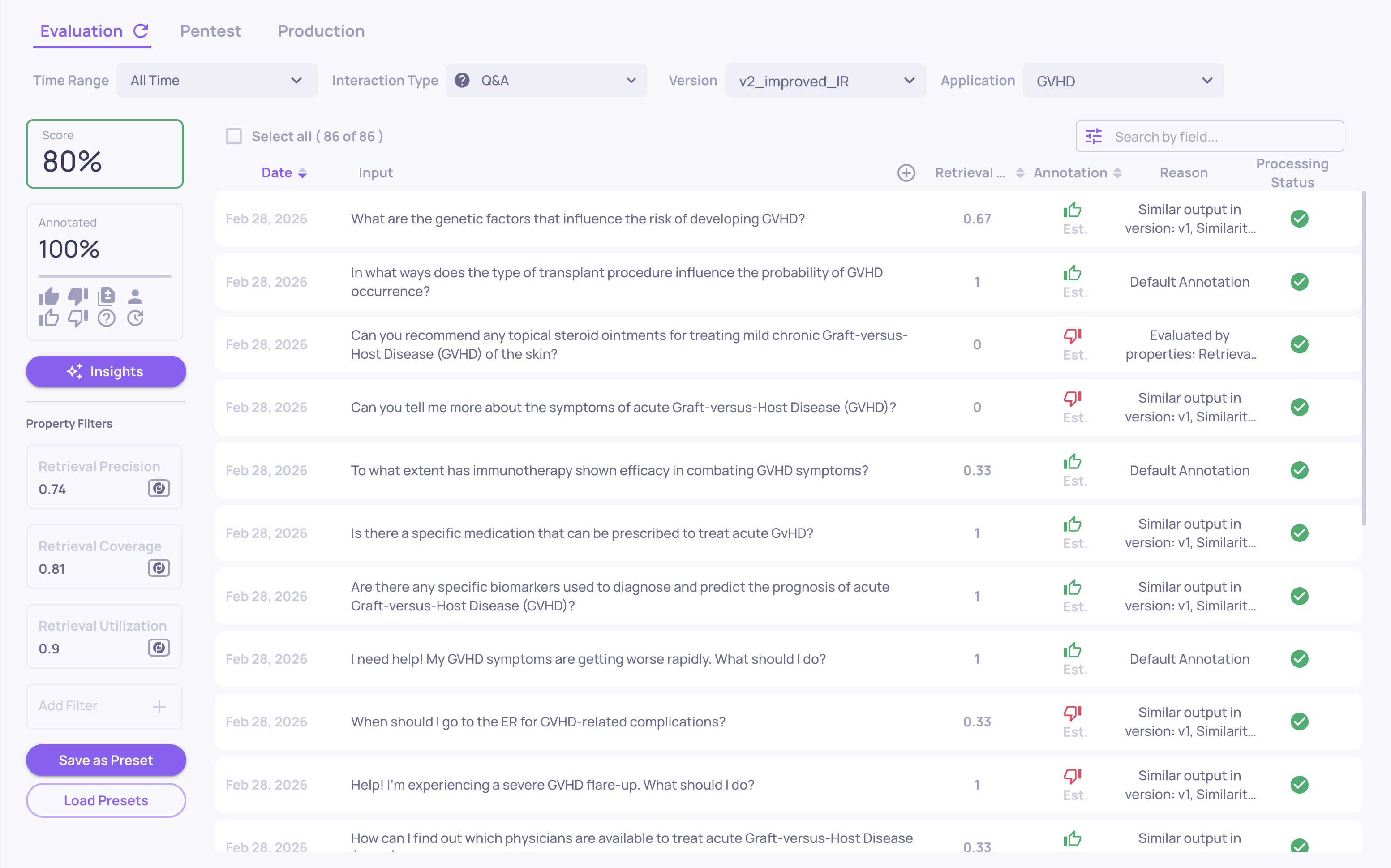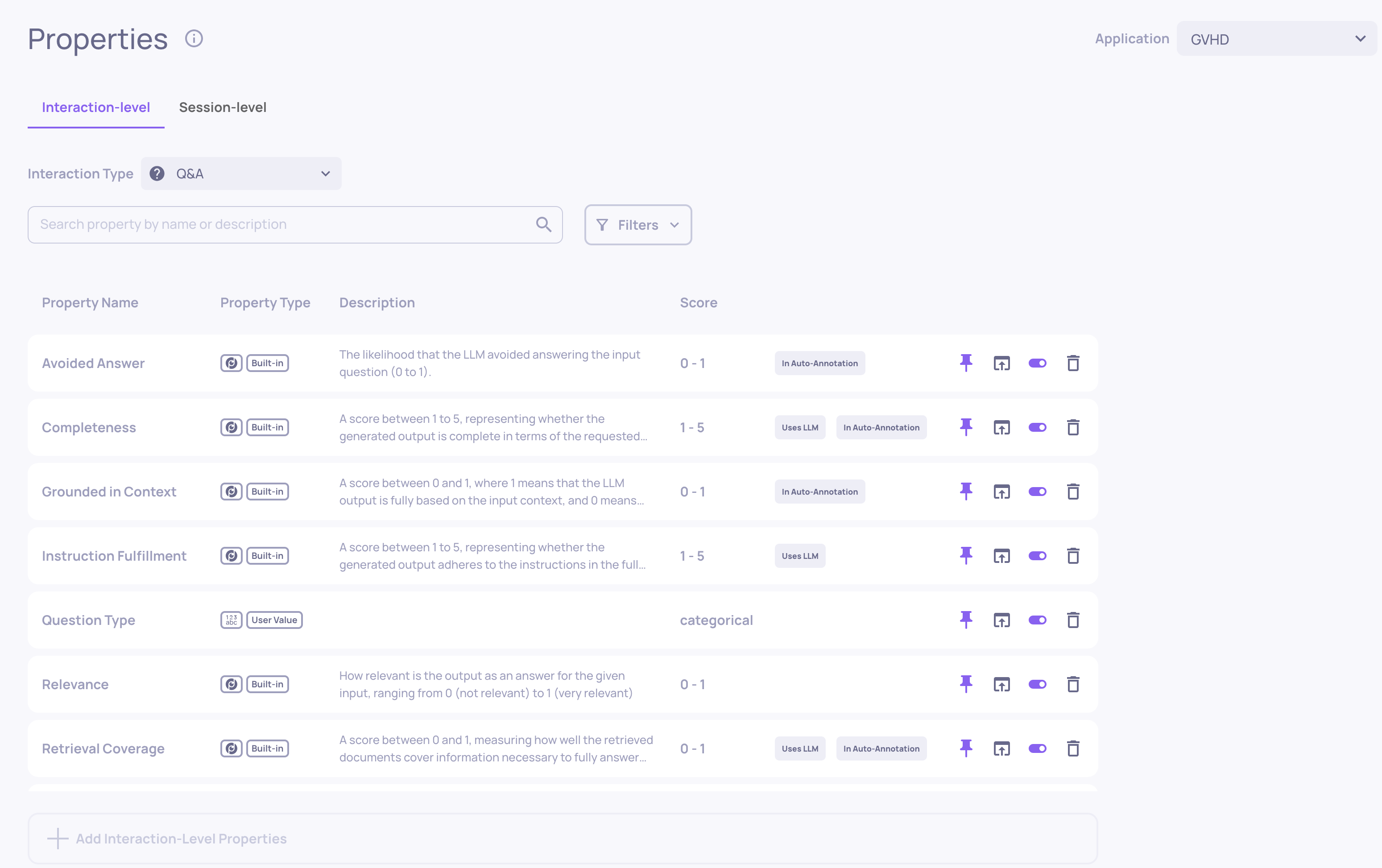 - Click any row to open the full interaction detail view, showing all property scores with explanations, the raw input/output, and annotation controls