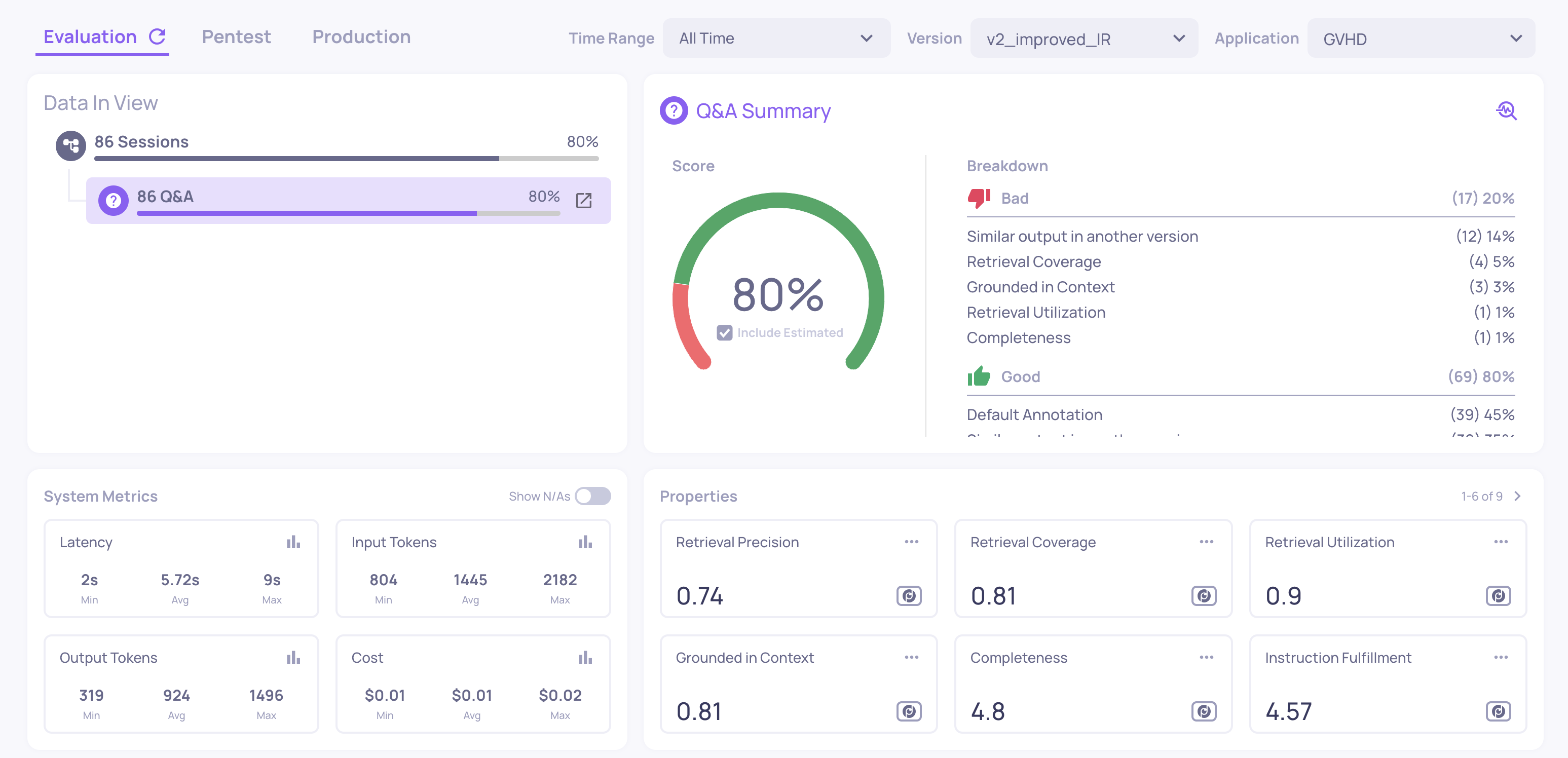 - System metrics summary - total and average latency, token usage, and cost across all interactions in this version
