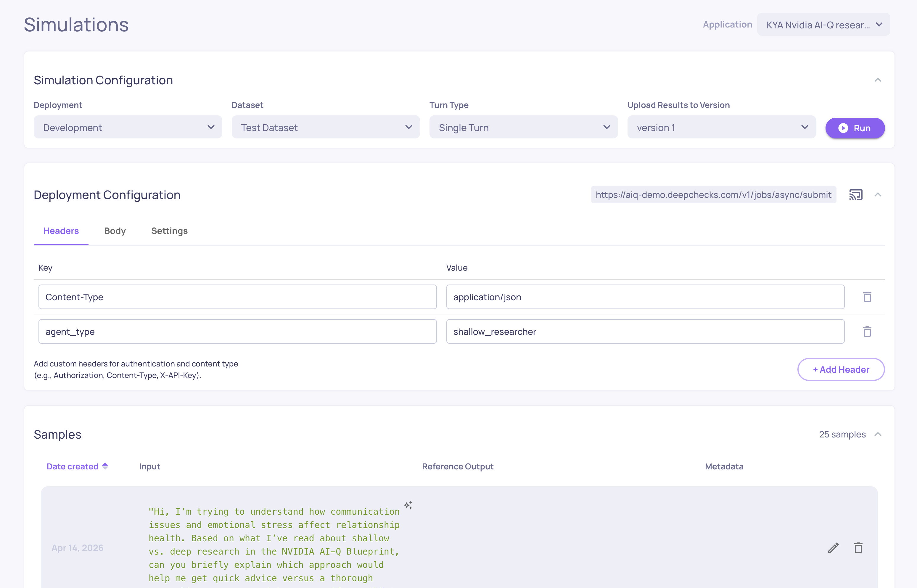 The KYA (Know Your Agent) simulation environment. Connect your agent's endpoint, generate test scenarios, and trigger your agent against them automatically - capturing every span and evaluating the results.