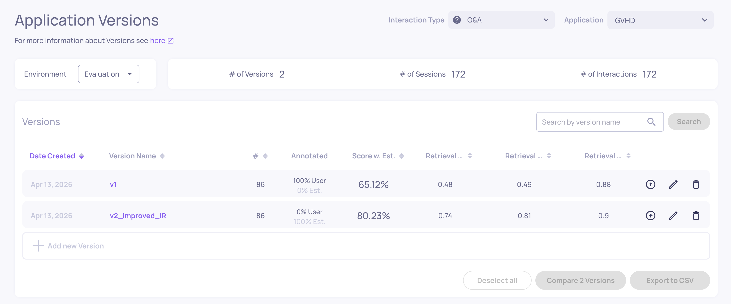 The main dashboard for a specific version. This is your primary landing screen for evaluation results. It shows: