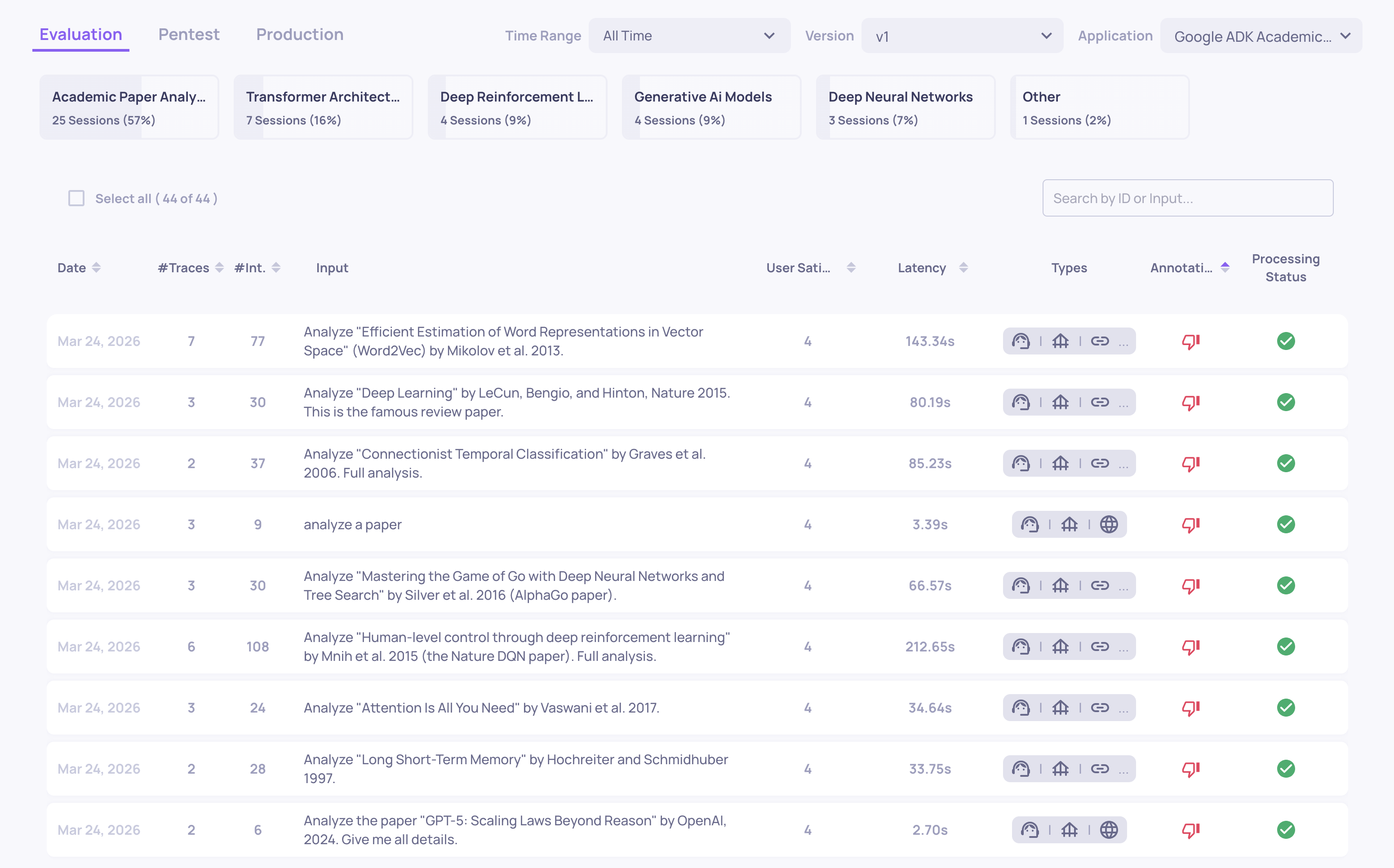 A table of every interaction in the current version and environment. Each row shows the input, output, annotation status, interaction type, key property scores, and system metrics (latency, tokens, cost).