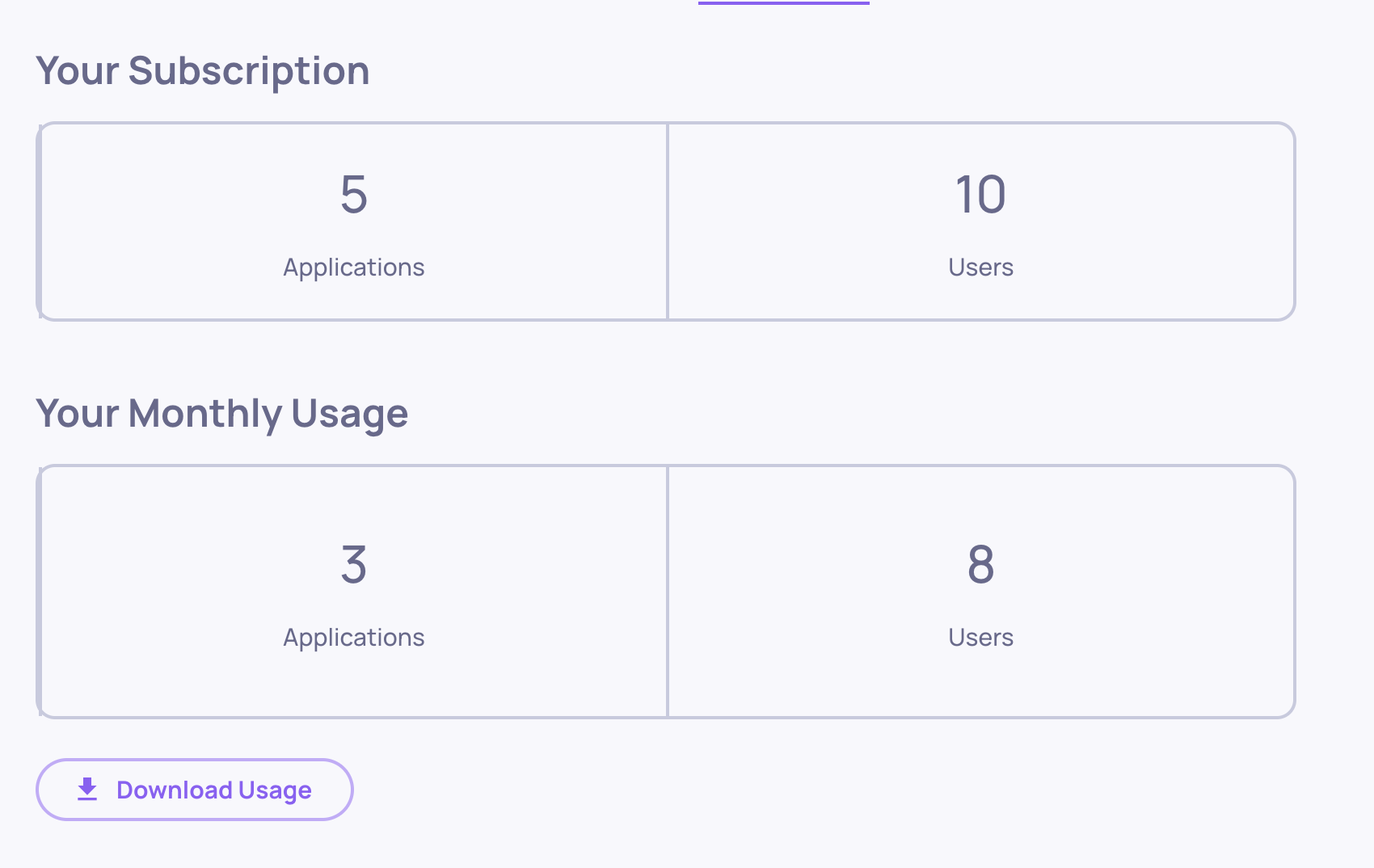 - Click Download Usage to export a CSV with token consumption broken down by application, version, environment, service type, and model.