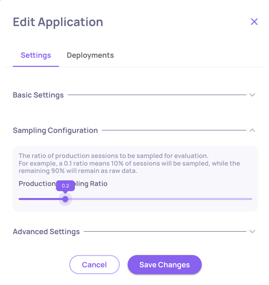 0.2means 20% of sessions are evaluated; the remaining 80% are stored but not processed through LLM properties. - Click Save Changes.
