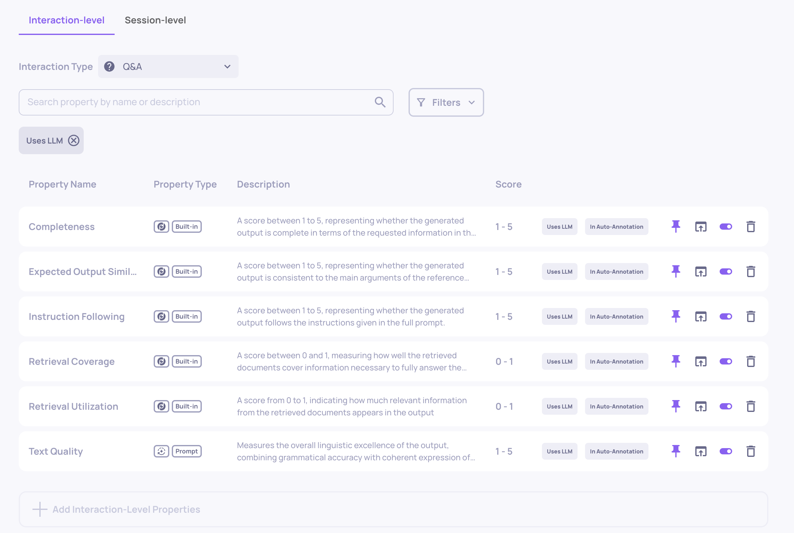 Each LLM property runs inference on every interaction it's applied to. In agentic use cases with many spans per session, a single unnecessary property can increase your costs significantly.