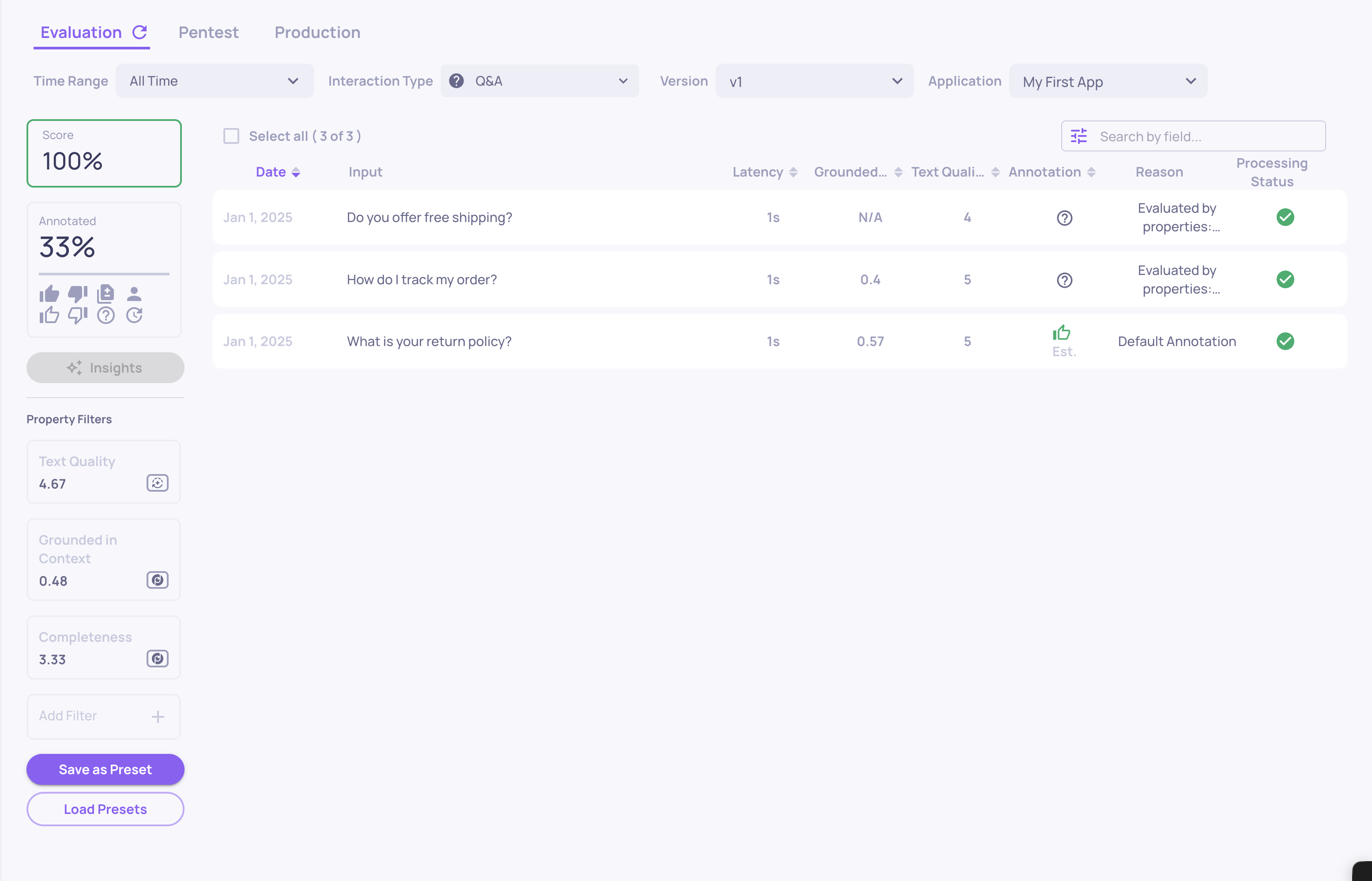 Note: Property calculation runs asynchronously. If you don't see scores immediately, wait a moment and refresh. LLM-based properties take longer than text-based ones.