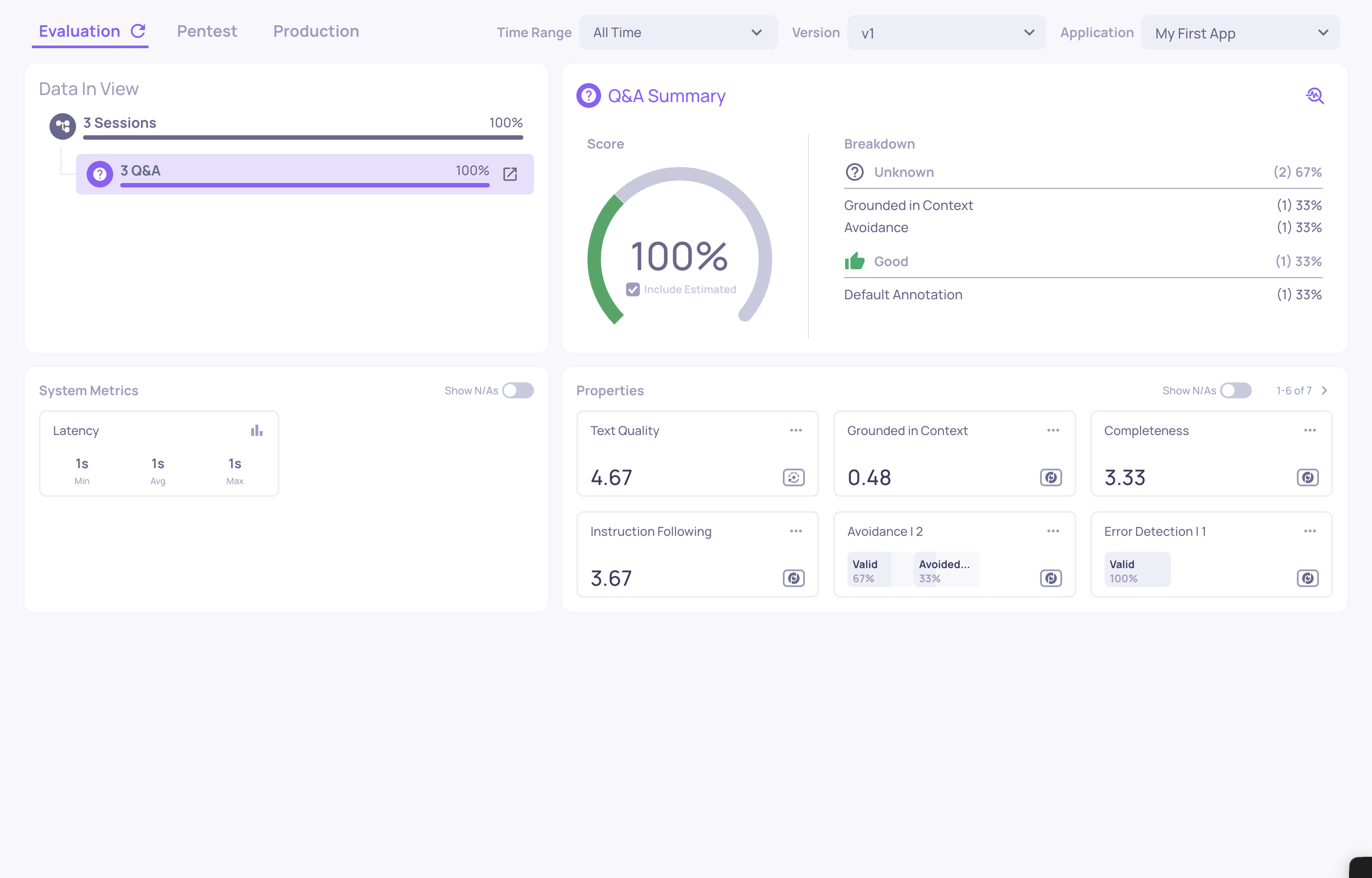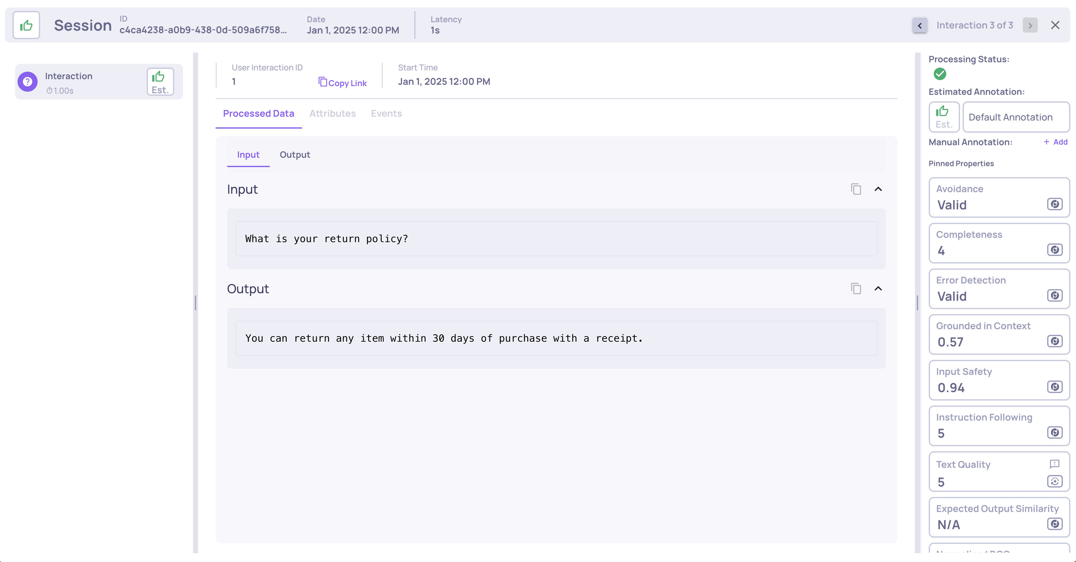 Because you included started_at and finished_at timestamps, Deepchecks automatically calculated latency for each interaction. In a real pipeline, you can also log token counts and model cost - giving you a live observability view of your system's operational health alongside quality evaluation.