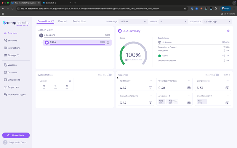 This quickstart shows you how to get evaluation results in Deepchecks without writing any code. You will create an application, upload a sample CSV file, and explore the results - all from the Deepchecks platform.