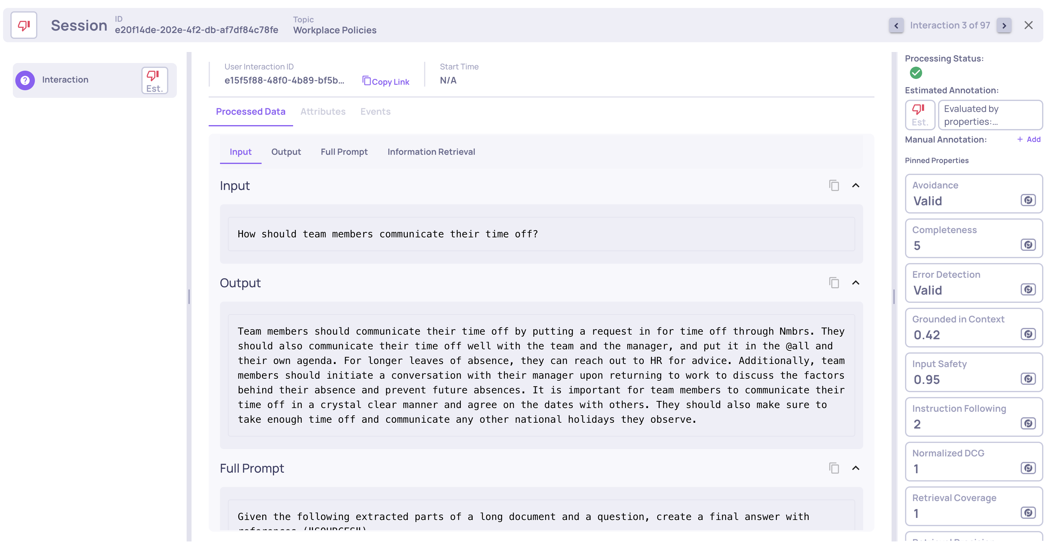 annotationcolumn in the CSV). Not all rows have them. - Outlined badges - these are Deepchecks' estimated annotations, automatically computed based on property scores. Every interaction gets one.