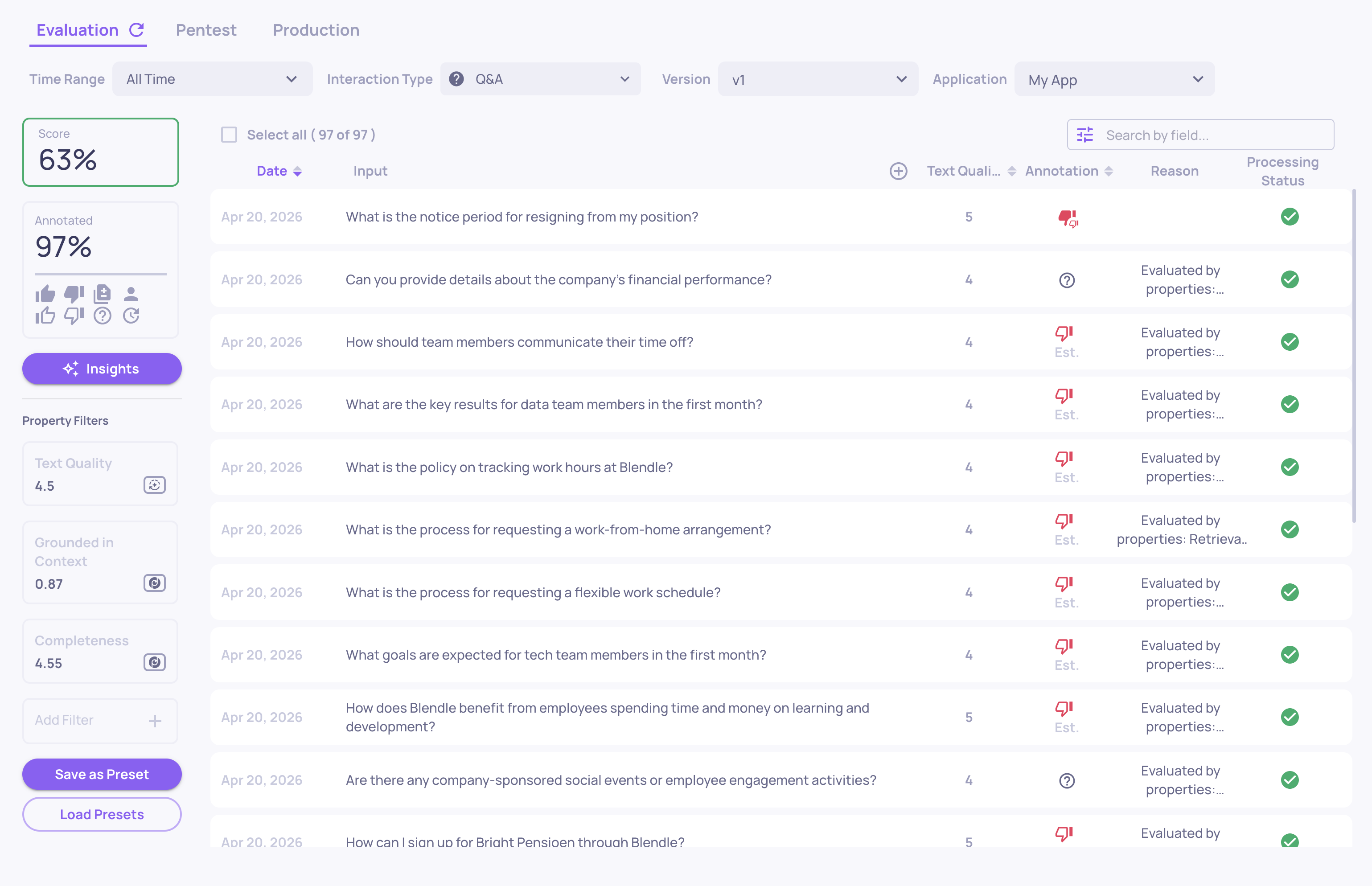 Click any row to see the full input, output, detailed property scores with explanations, and operational data
