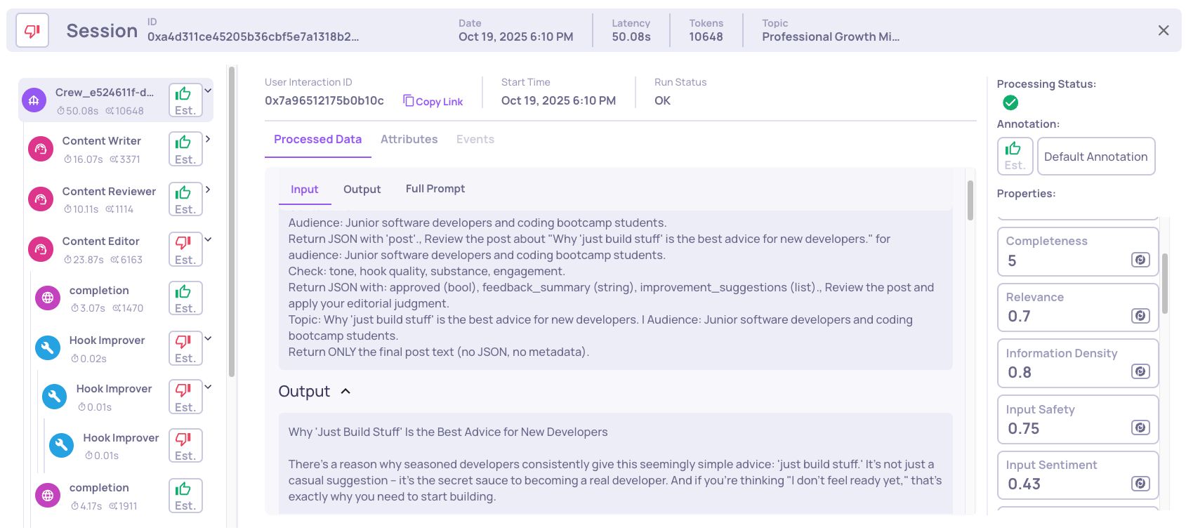 Traditional monitoring would mark this as "success." Only by examining the trace can we see the Editor's internal reasoning and discover it's avoiding tool calls.