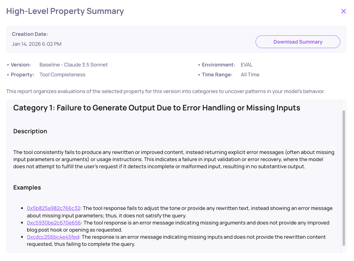 Back to the Overview tab under Tool interaction type analyze property failures for the Tool Completeness property.