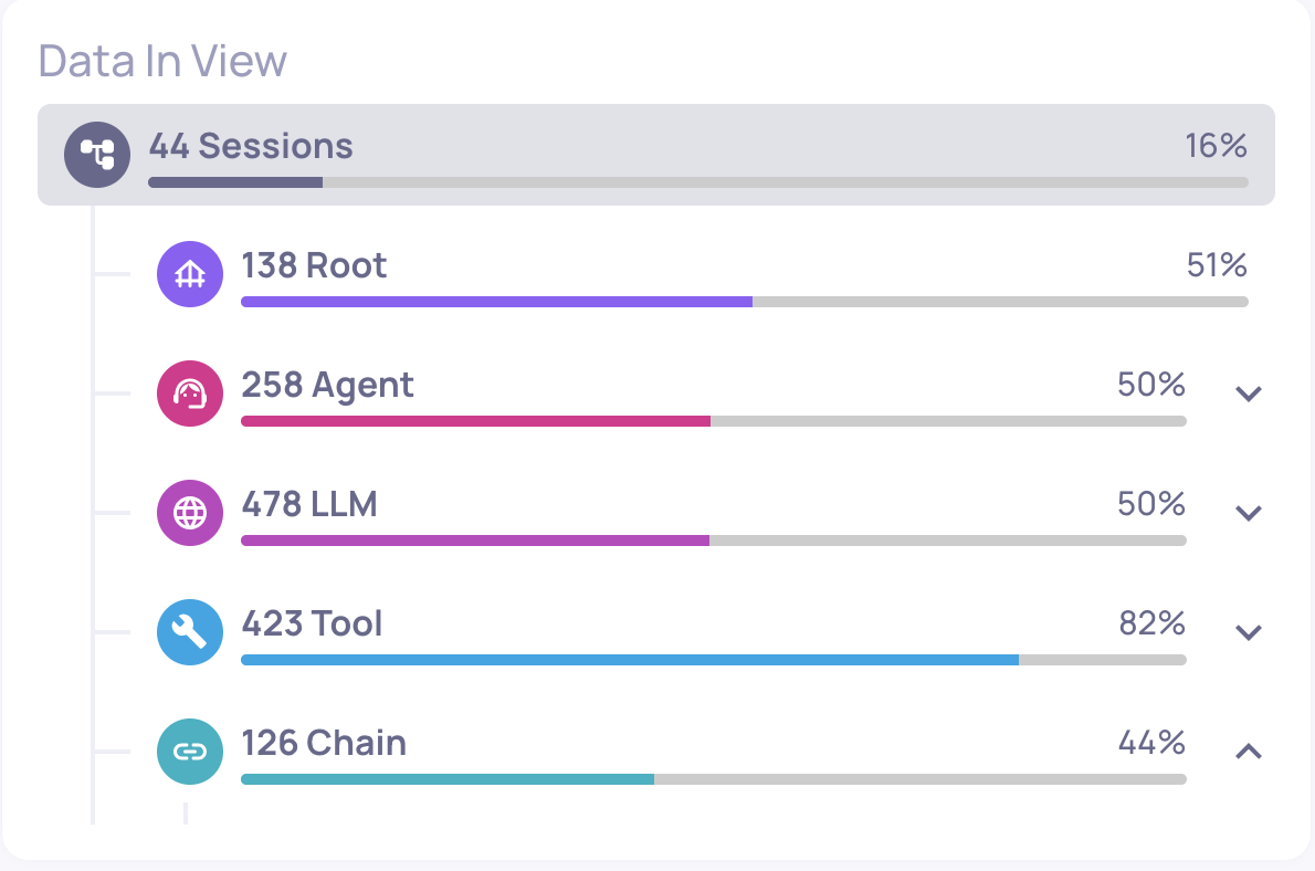 In Deepchecks, every span becomes an interaction - filterable, inspectable, and independently evaluated. The interaction types (Root, Agent, Chain, LLM, Tool, Retrieval) come from the span kinds you assign.