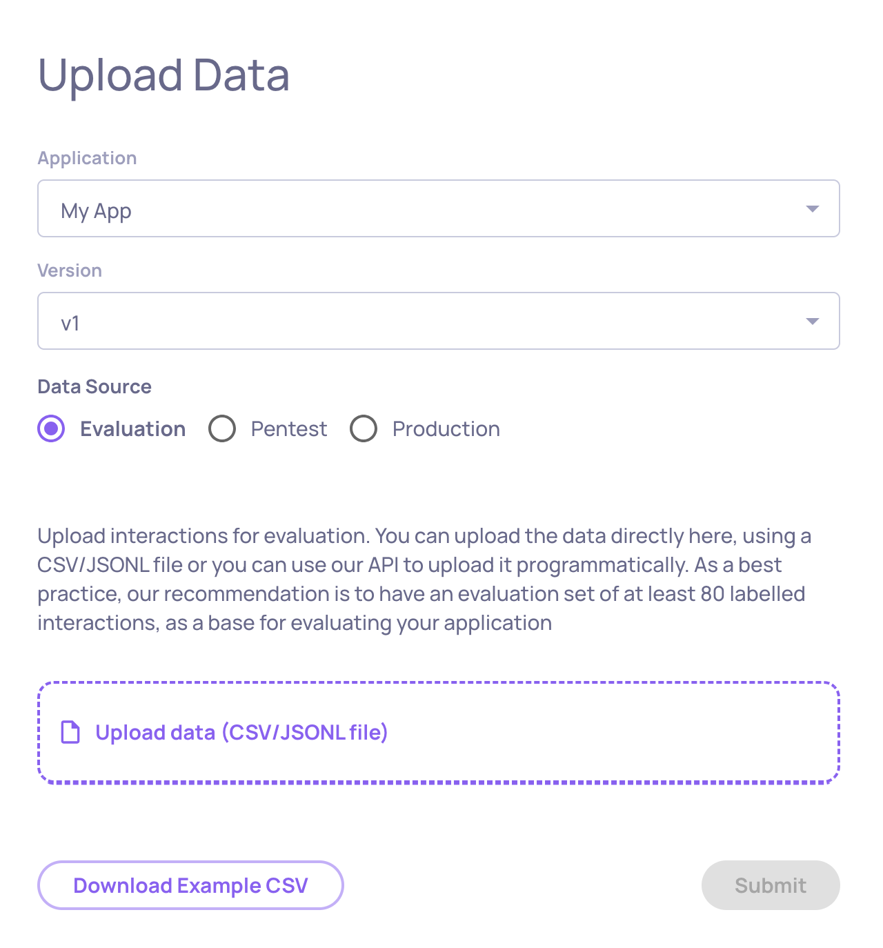 Upload interaction data to Deepchecks from the browser using a CSV file - no code required.