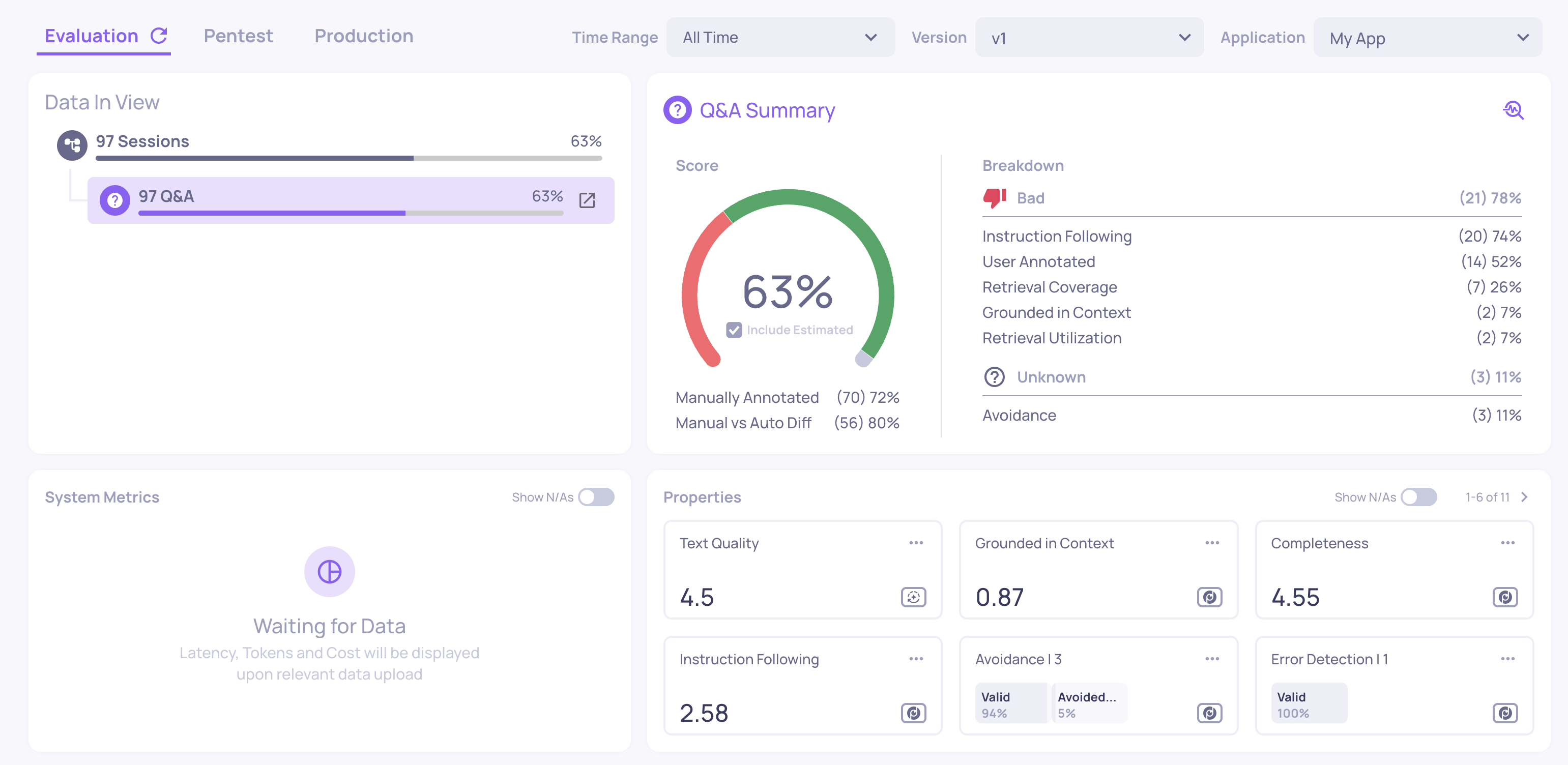 started_at,finished_at, and token fields). - Calculated properties on every interaction - quality scores like Grounded in Context, Avoided Answer, and Fluency.