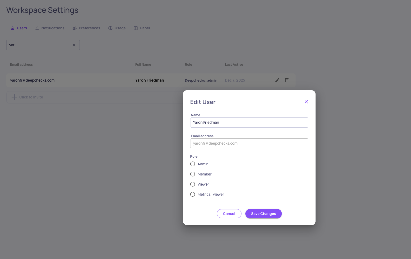 - For existing users - Admins and Owners can change a user’s role via the Users tab in Workspace Settings.