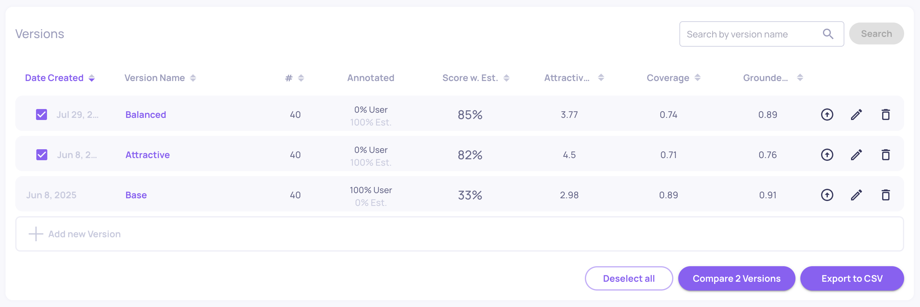 To perform the comparison, select the versions named Attractive and Balanced, then click on "Compare 2 Versions."
